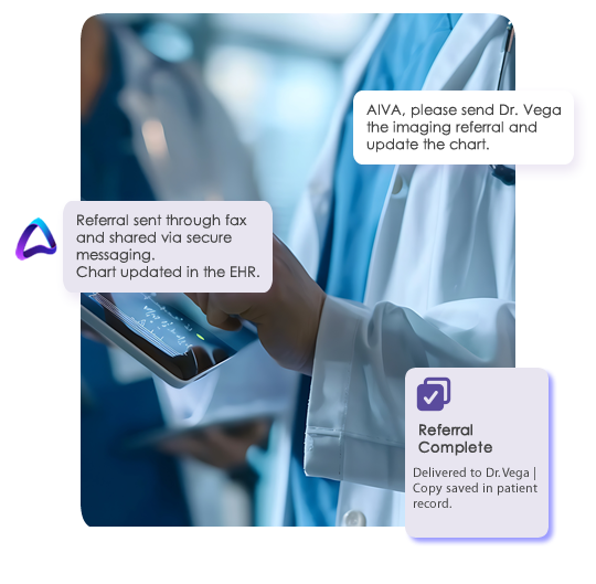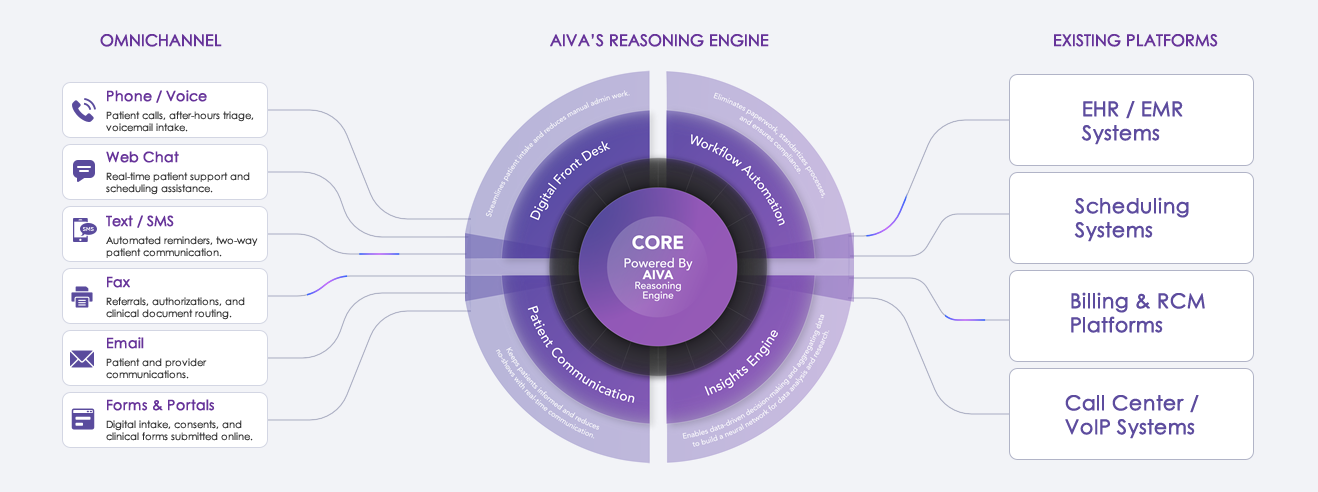 AIVA MD unifies voice, chat, fax, and data through a reasoning engine built for healthcare, helping every team work smarter, faster, and more humanly.